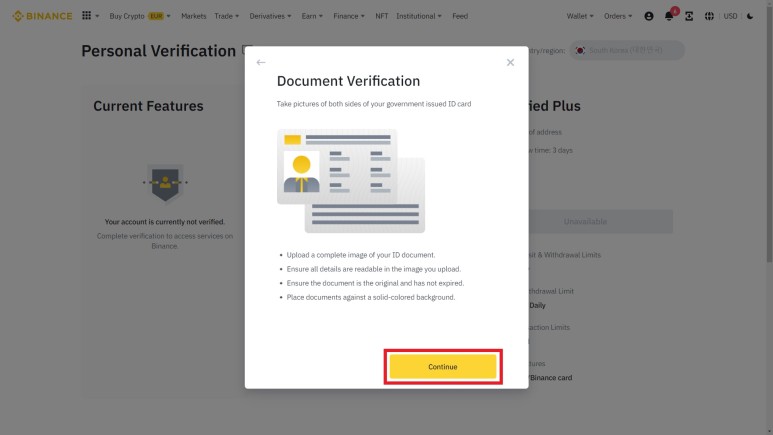 여권 또는 운전면허증 등 원하는 신분증을 선택하고 Continue를 클릭해 주자.