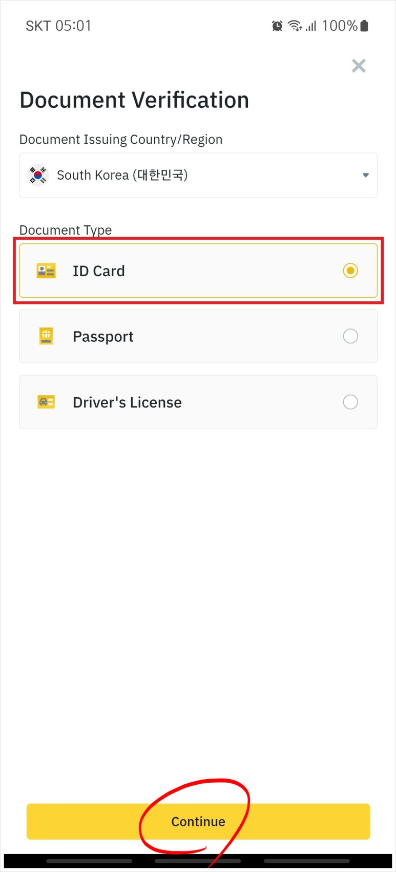 아래와 같이 주민등록증, 여권, 운전면허증 셋 중 하나를 선택해서 체크하고 Continue를 클릭한다.
