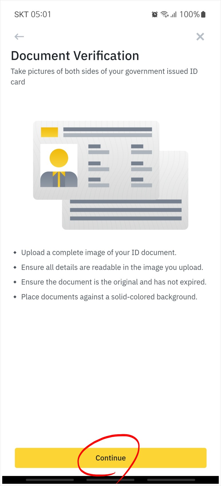 신분증 사진을 찍기 전에 바이낸스 앱이 휴대폰의 카메라를 사용할 수 있도록 허용해 주어야 한다.