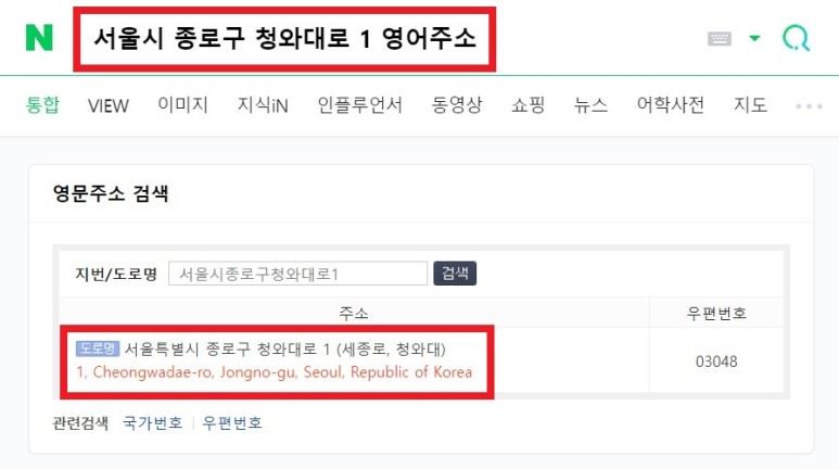 참고로 영어 주소의 경우 아래의 이미지와 같이 네이버 검색창에 한글 주소와 함께 영어주소라고 입력해 검색하면 영어 주소를 출력해 준다.