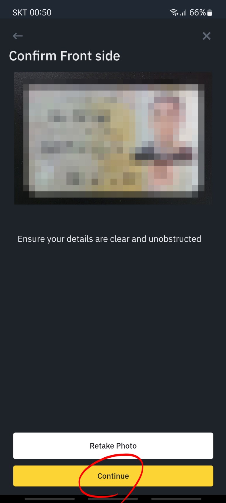 먼저 신분증의 앞면 프레임 안에 맞추어 촬영을 하고 글씨를 읽을 수 있도록 잘 촬영이 되었다고 판단되면 Continue를 클릭해 뒷면의 사진 촬영으로 넘어간다.