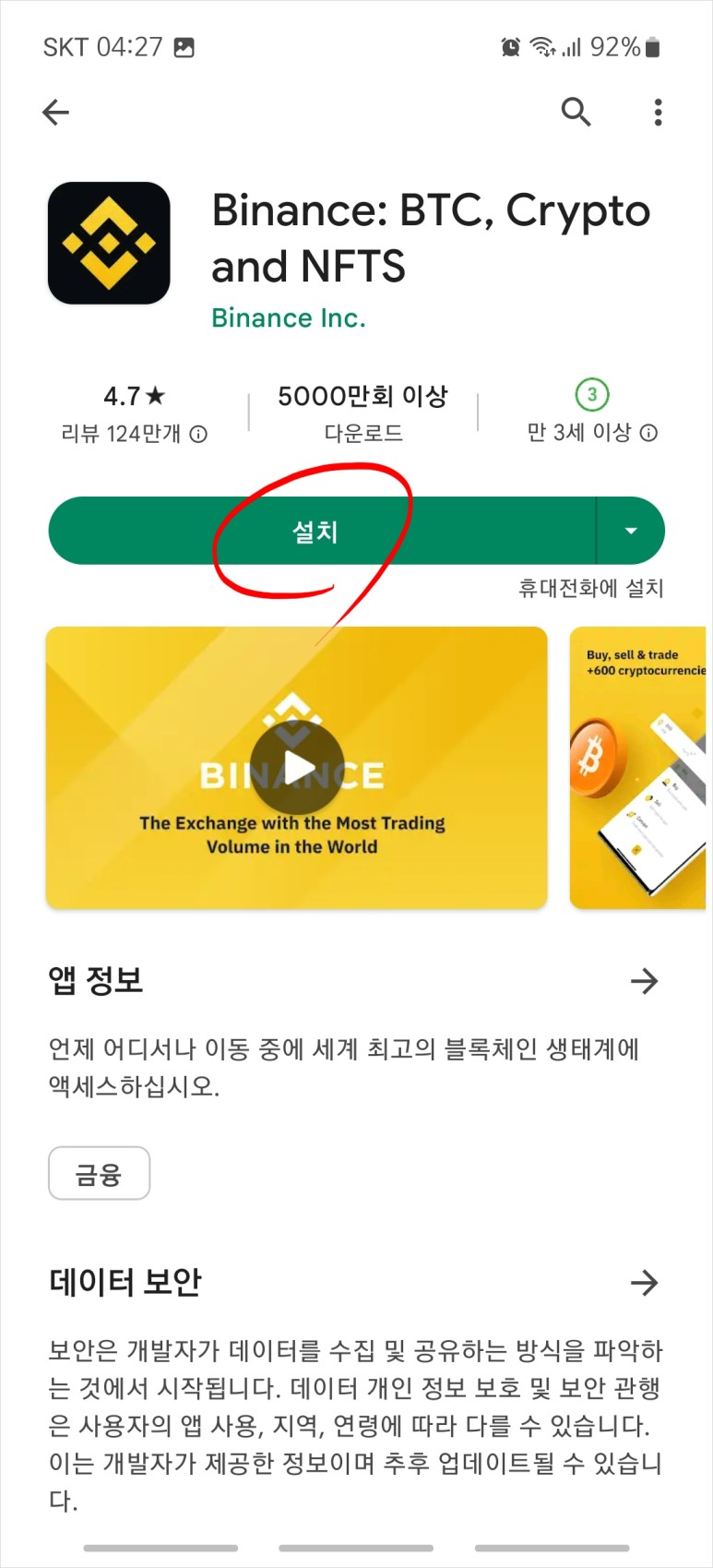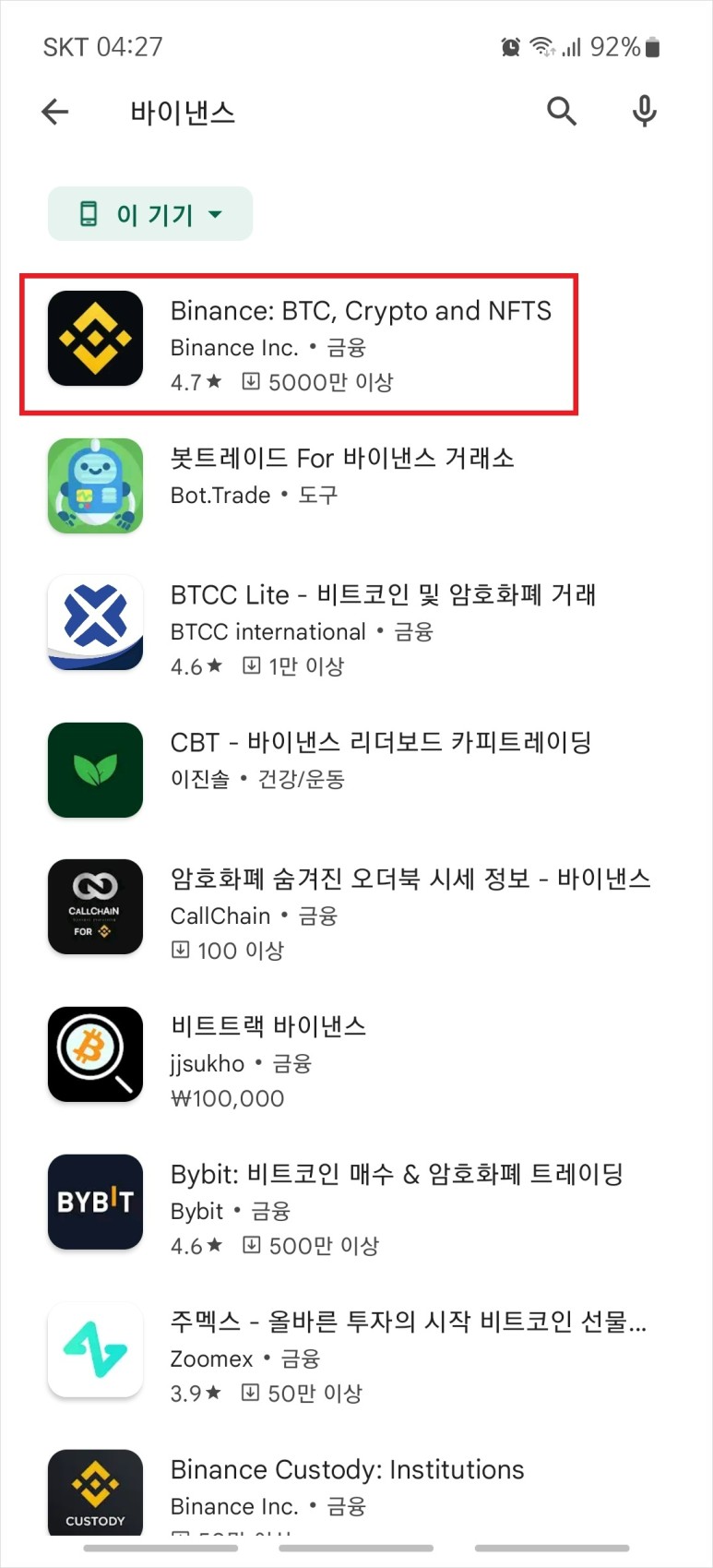 또는 구글 플레이 스토어에서 한글로 바이낸스라고 검색해 맨 위에 뜨는 앱을 설치해도 된다.