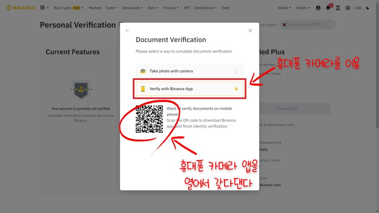 사용 중인 PC가 노트북이 아니거나 웹캠이 없는 경우에는 두 번째의 Verify with Binance App를 선택하면 된다.